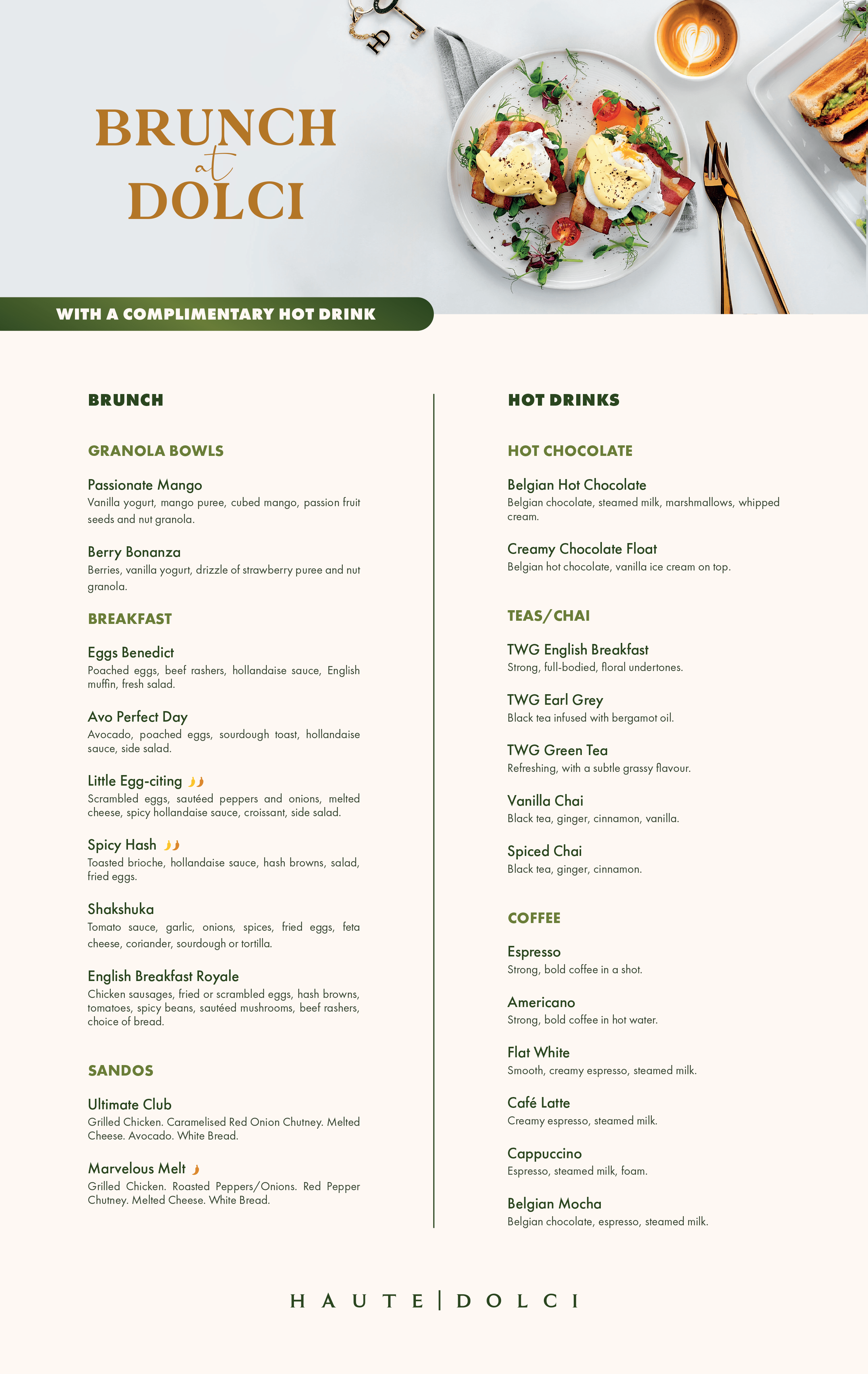 Pair your scrumptious brunch with one of our premium hot drinks, free of charge! Here are the delightful options you can choose from: