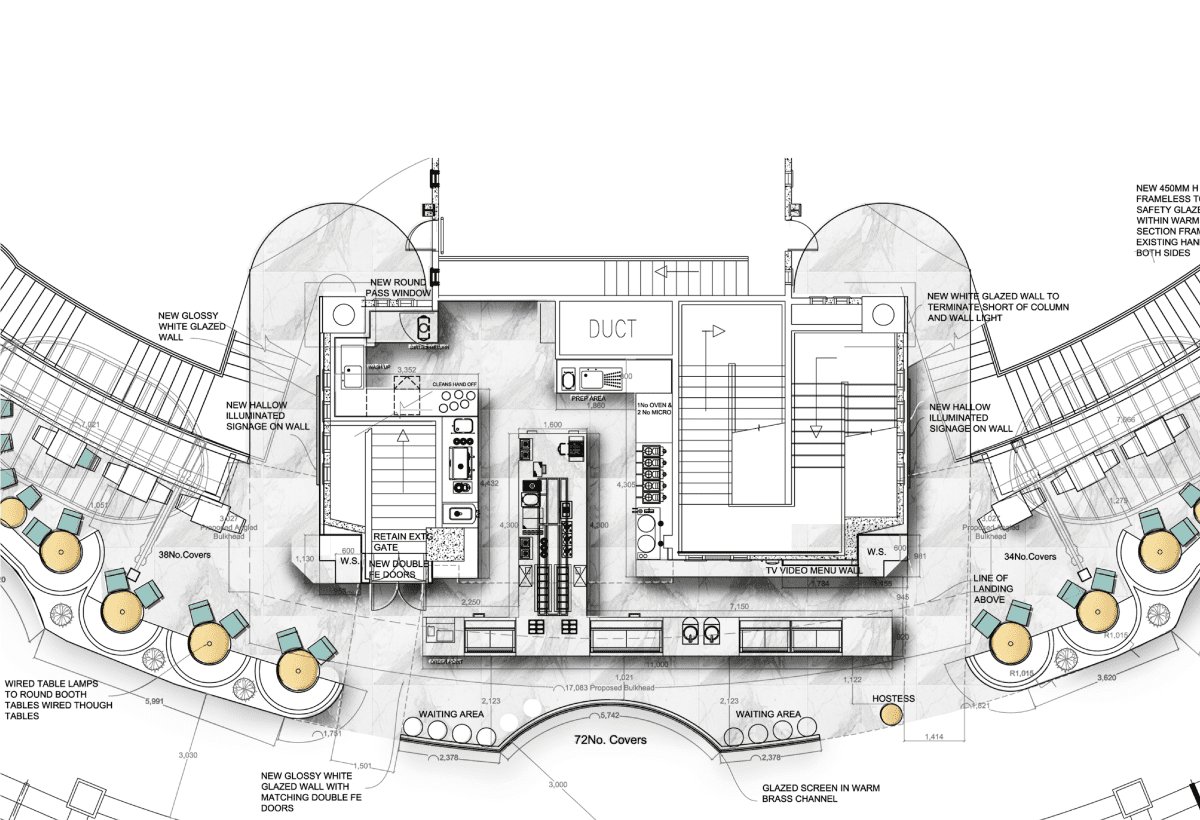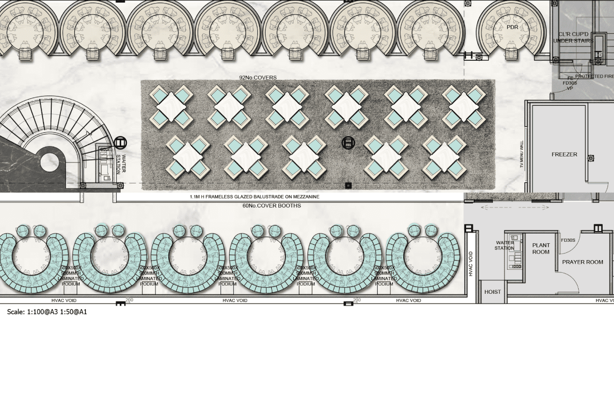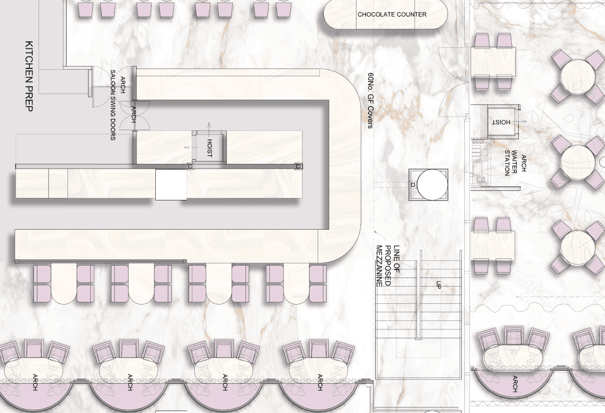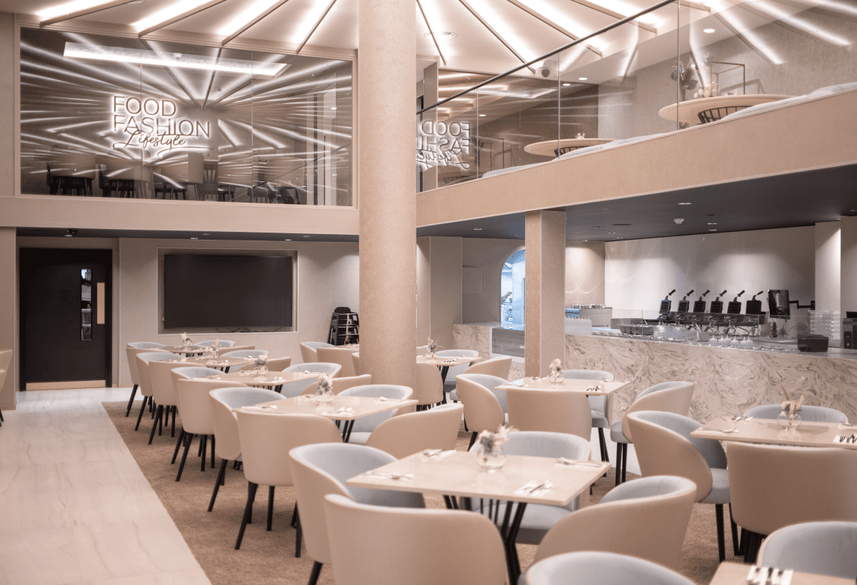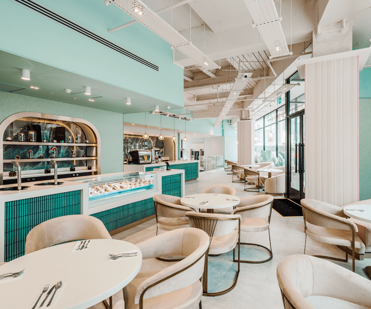The largest format, offering a comprehensive menu including desserts, brunch, and café items, requires distinct zones for dining, lounging, and takeaway orders.