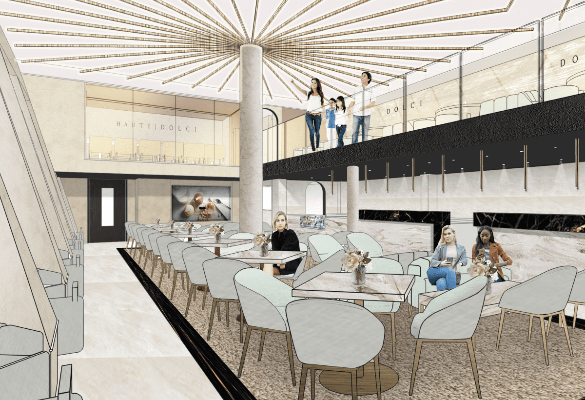 A balanced mix of kitchen and seating areas, featuring a stylish and inviting interior for a full-service dessert experience.
