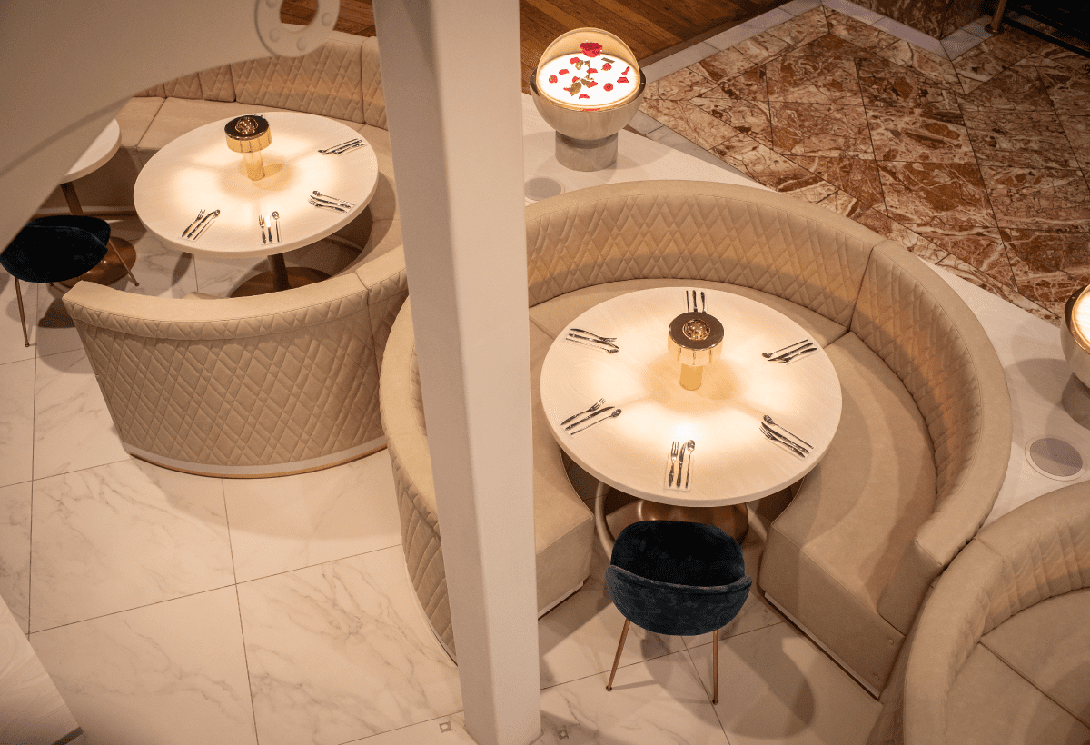 Spacious design featuring an open-plan layout with a central island for dessert preparation, offering an interactive dining experience.